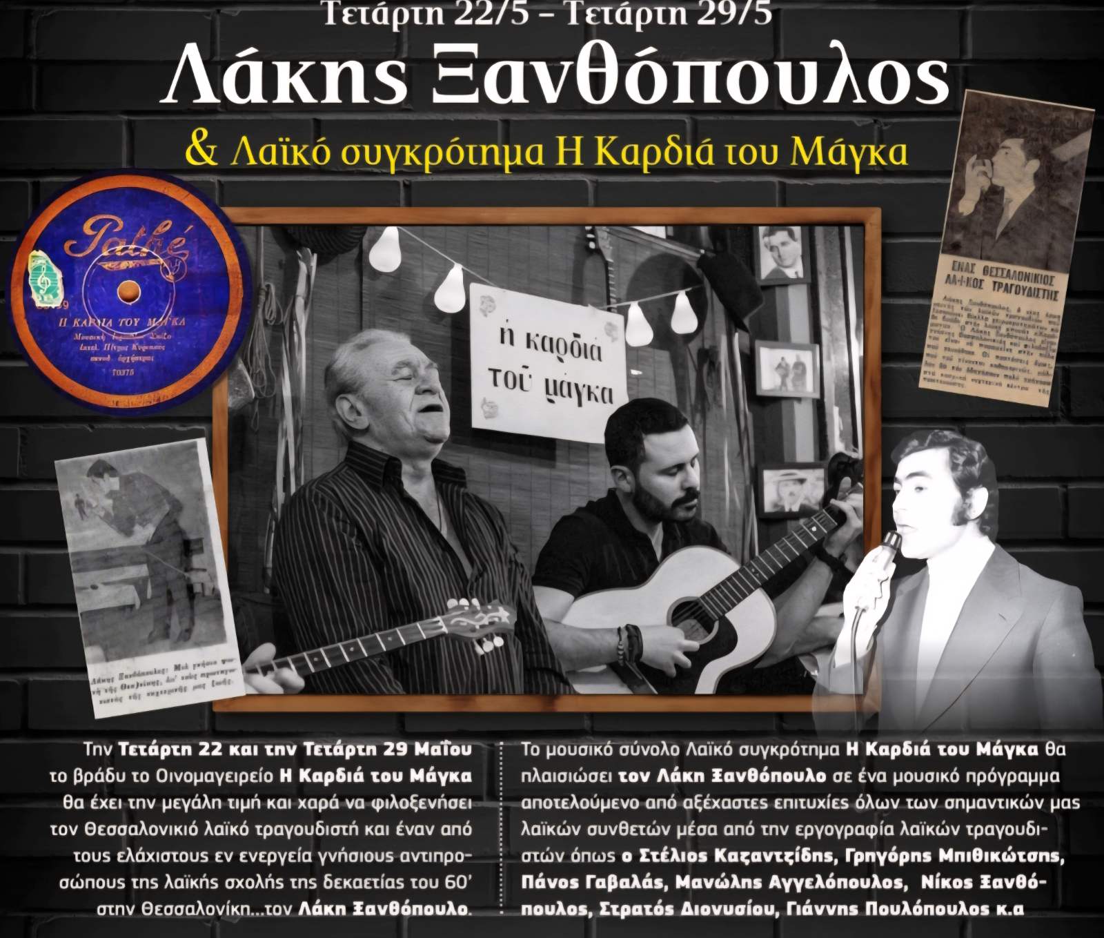 Μείνετε κοντά μας και ενημερωθείτε για τις ζωντανές μας εμφανίσεις, θεματικές βραδιές και μουσικά αφιερώματα. Κάθε εκδήλωση είναι μια μοναδική εμπειρία που παντρεύει τη λαϊκή παράδοση με τη ζεστή ατμόσφαιρα της παρέας. Εδώ θα βρείτε το επόμενο μας μουσικό ταξίδι.